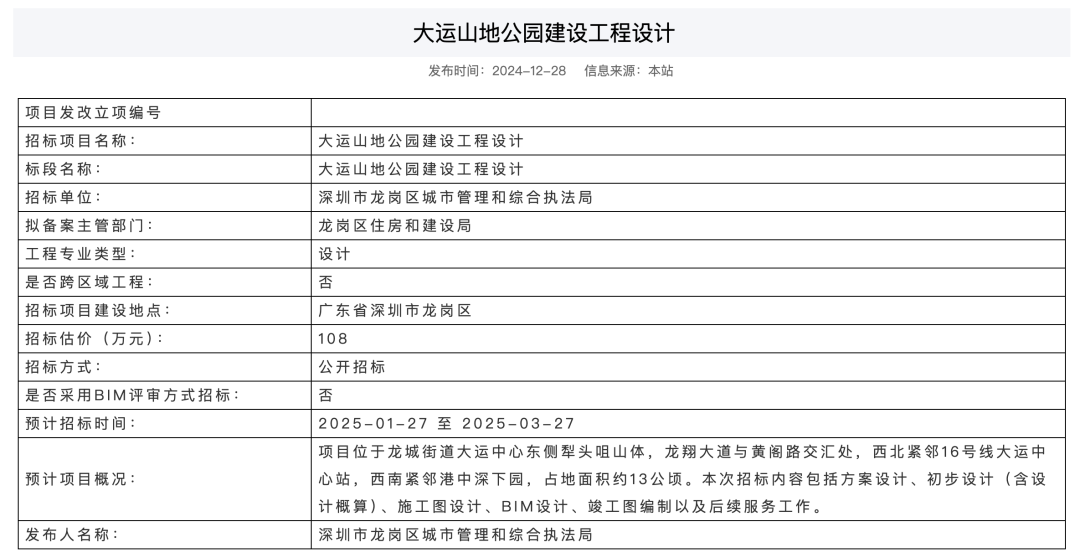 记者检索发现,2024年年底,深圳市龙岗区城市管理和综合执法局发布大运山地公园建设工程设计招标计划。计划招标时间为2025年1月27日至2025年3月27日,计划招标金额108万。本次招标内容包括大运山地公园的方案设计、初步设计(含设计概算)、施工图设计、BIM设计、竣工图编制以及后续服务工作。