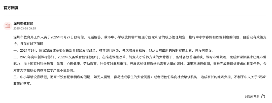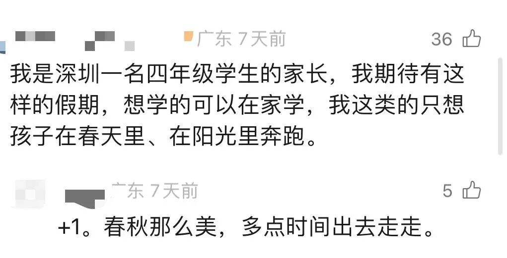 但也有人认为,深圳双职工家庭多,家长没有相应的假期,也不一定能请到假,孩子放假如何安置成了问题。还有人认为,假期加起来太多,对学生的学习节奏产生了影响。