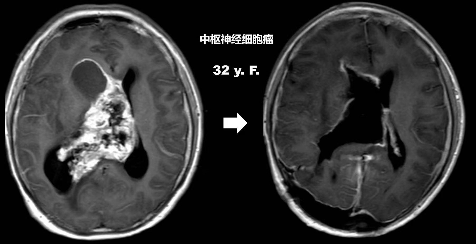 为寻求进一步诊治,阿玲和老公决定前往北京求医。在北京的医院,阿玲被诊断为中枢神经细胞瘤,这是少见的脑肿瘤。令人吃惊的是,阿玲脑室内的这颗肿瘤接近成人拳头大小。因为肿瘤已几乎将整个脑室腔占满,且其周围全部是重要神经功能结构,如不及时进行手术,将进一步压迫这些区域;同时,这种低度恶性的肿瘤,手术切除的程度直接会影响患者的预后。“保守治疗吧!”出于同样的理由,北京的医院也不建议阿玲手术。从此,阿玲和丈夫开始了漫长的求医路。