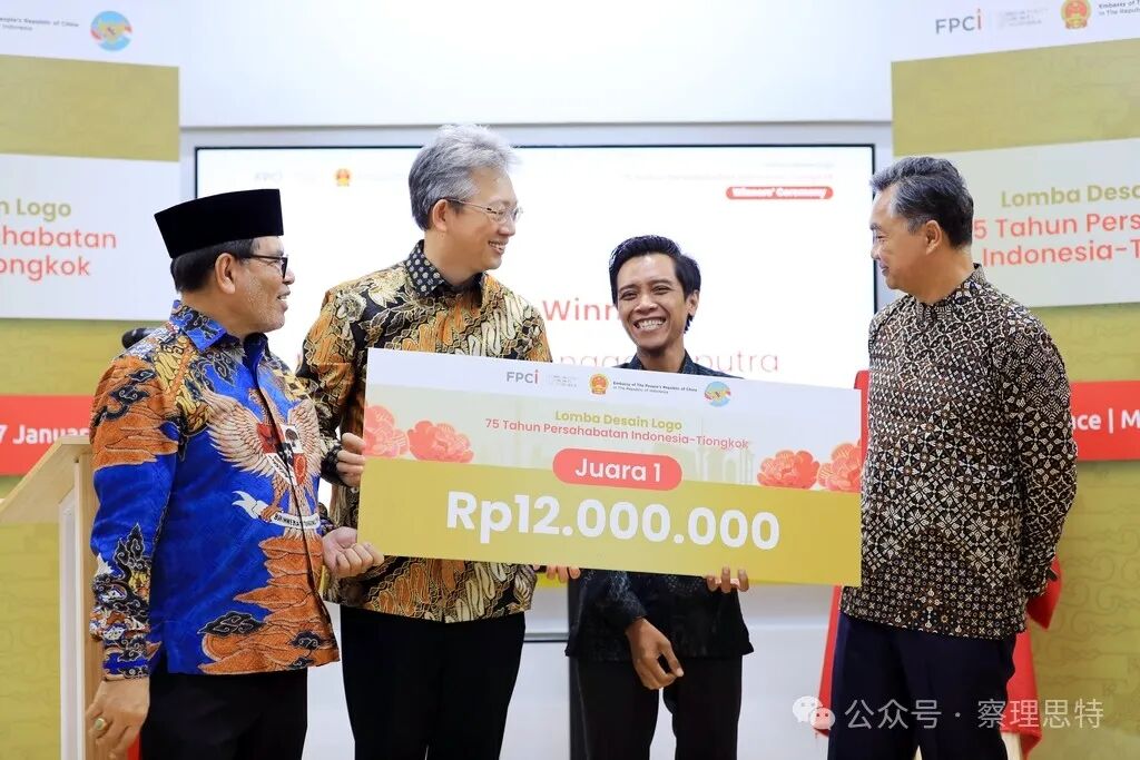 ▲当地时间2025年1月7日,印度尼西亚雅加达,中印尼建交75周年LOGO设计大赛颁奖仪式暨官方纪念LOGO发布活动举行,中国驻印尼大使王鲁彤(左二)、印尼驻华大使周浩黎(左一)、印尼外交政策协会创始人兼主席迪诺(右一)共同为获得一等奖的选手(右二)颁奖。中新社记者 李志全 摄
