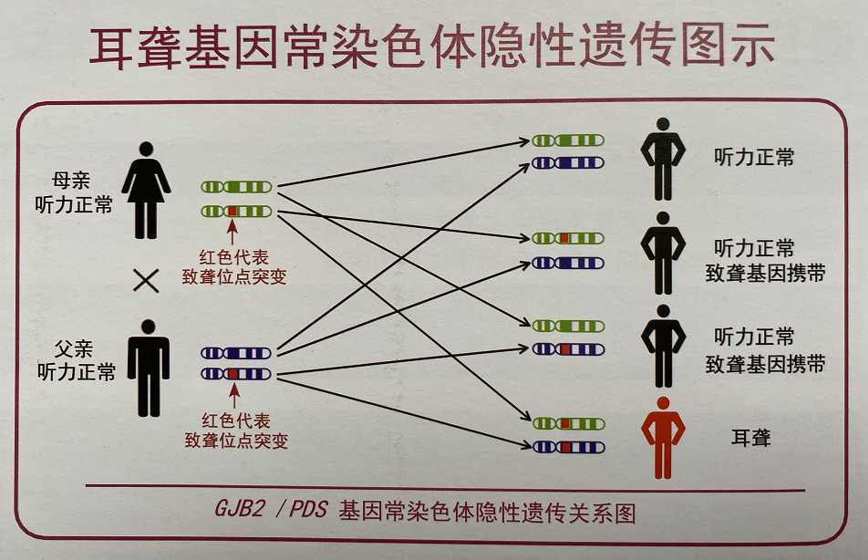 GJB2基因的致聋突变通常是常染色体隐性遗传,也就是说,如果父母各携带一个GJB2致病变异(但自身听力正常),那么孩子有25%的概率遗传到两个有缺陷的基因而出现耳聋。
