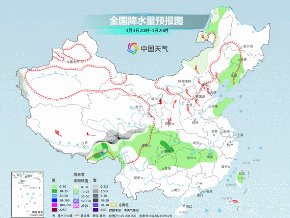 雨雪主要集中在新疆北部、内蒙古东部、东北地区(局地有中到大雪)以及西藏东部、川西高原、青海东南部(局地有大到暴雪)。