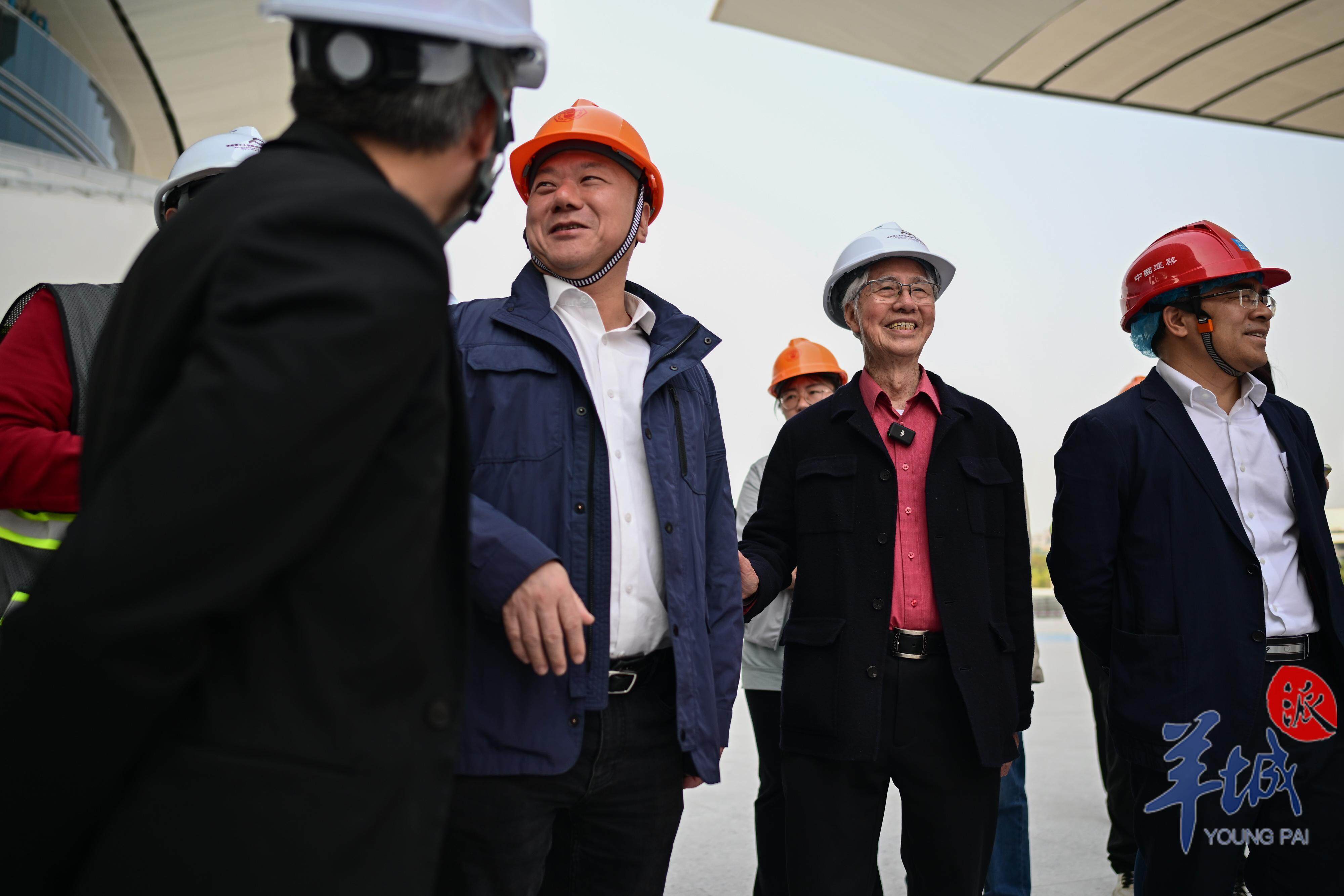 4月3日,中国工程院院士何镜堂(右二)走访十五运会主场馆广东奥林匹克体育中心施工现场,该改造项目由何镜堂院士领衔设计。