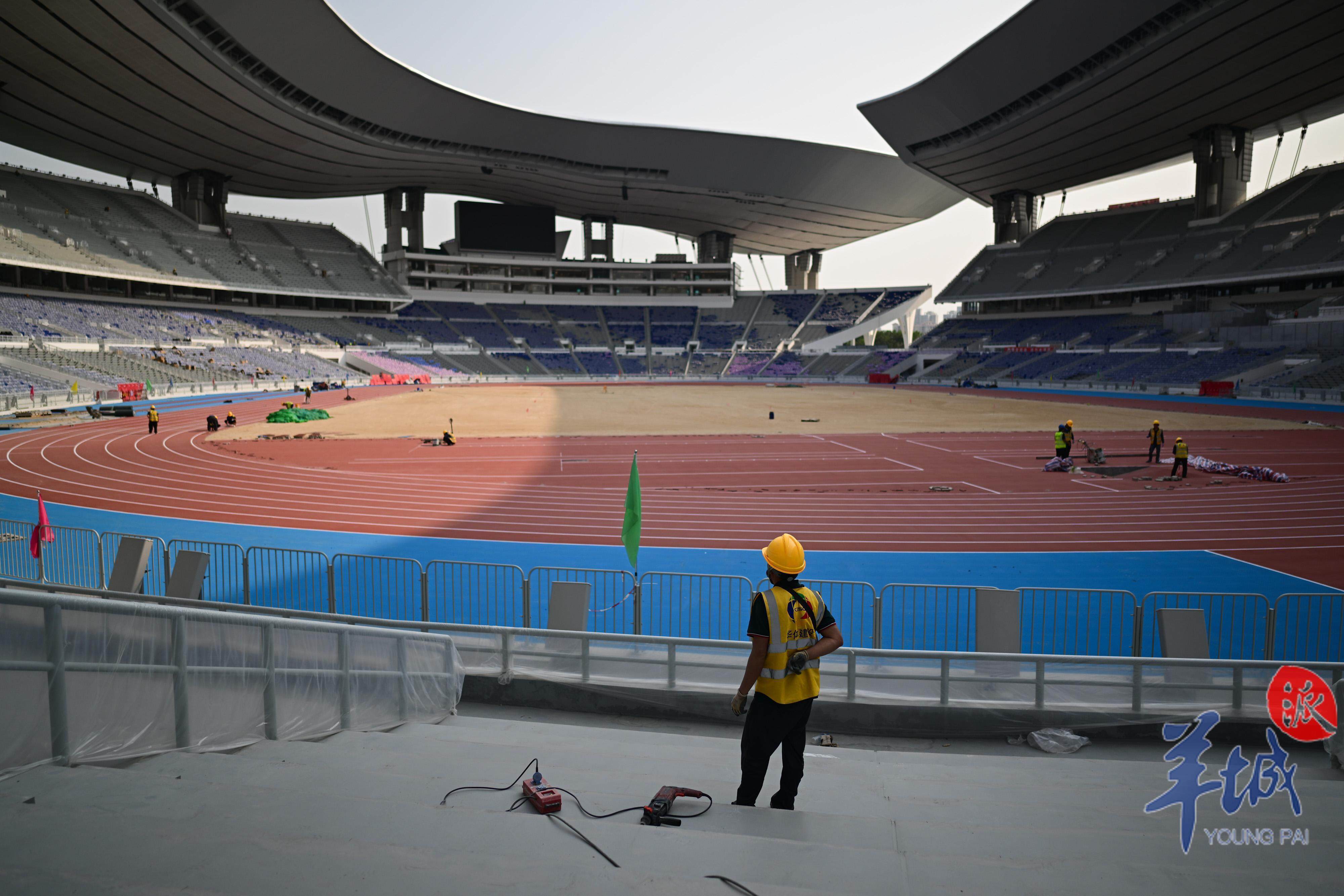 工人在十五运会主场馆广东奥林匹克体育中心内工作。