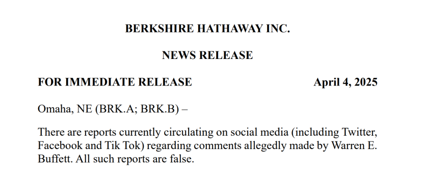 巴菲特曾表示,及时打击错误信息非常重要。他此前表示,在伯克希尔5月3日于内布拉斯加州奥马哈举行年度股东大会之前,他不会就市场、经济和关税等问题与任何人交流。