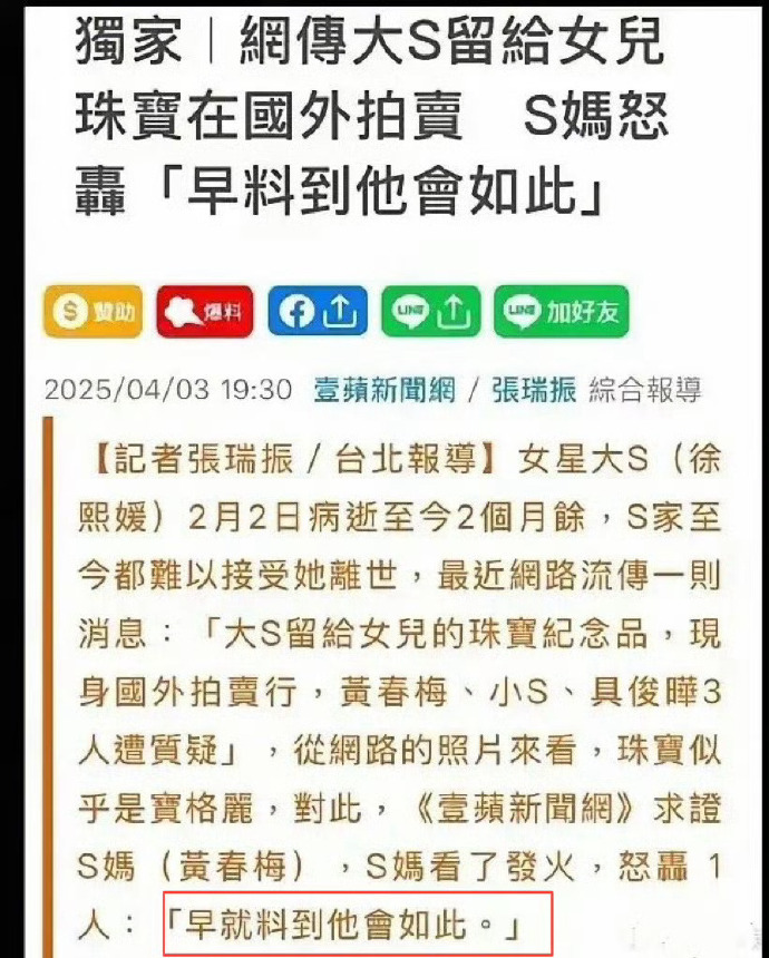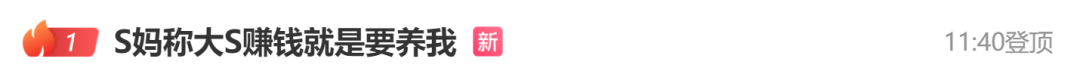 相关新闻被曝出后随即引发热议,4月5日,#S妈称大S赚钱就是要养我#词条登顶微博热搜。