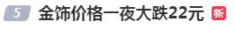 5日,国内金饰价格跟跌。周生生足金饰品标价926元/克,较前一日948元/克的价格下跌22元/克,2天跌32元/克。老庙黄金足金饰品标价931元/克,较前一日946元/克的价格下跌15元/克,2天跌30元/克。