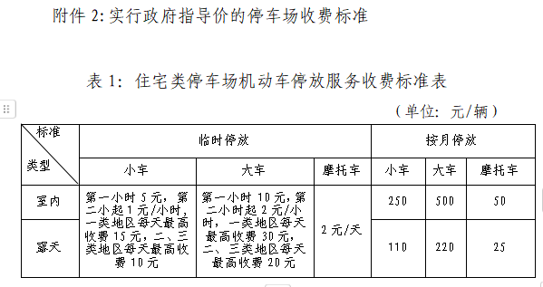 原政府指导价收费标准为:室内月卡250元/月;露天月卡110元/月;临时车第一小时5元,第二小时起1元/小时,一类地区每天最高收费15元,二、三类地区每天最高收费10元。