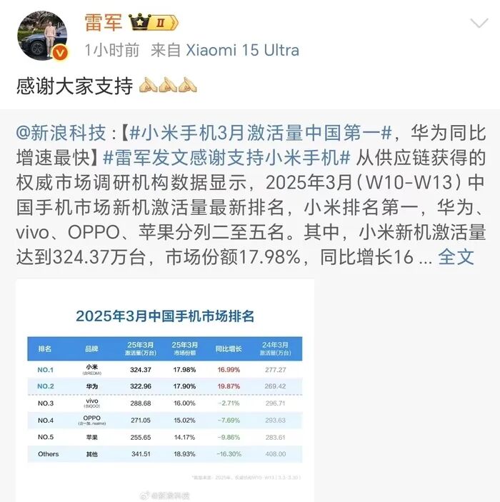 同日,小米多位高管也针对这一消息先后发文。其中,小米集团合伙人、总裁,手机部总裁、小米品牌总经理卢伟冰称:“中国手机市场3月,小米份额登顶,唯二正增长品牌!”