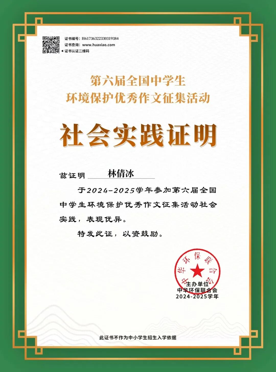 回顾这段参赛历程,每一步都凝聚着林倩冰对环保的热爱与执着。她感叹道:“这次活动让我深刻认识到,环保绝非一句空洞的口号,而是关乎人类未来的紧迫使命。我们每个人都是生态环境的守护者、建设者,守护地球就是守护我们的未来。未来,我将继续怀揣对环保的满腔热忱,用文字传递环保的重要性,以实际行动践行绿色理念。我期待更多同学加入环保队伍,携手共进,为建设美丽中国、守护地球家园贡献力量 ,让绿色成为地球永恒的底色。”