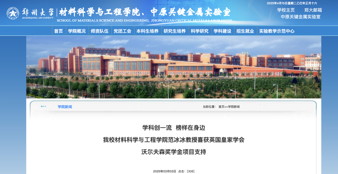 近日,郑州大学材料科学与工程学院教授范冰冰获英国皇家学会沃尔夫森奖学金项目支持,引发关注。据学院官网消息,英国皇家学会沃尔夫森奖学金是由英国皇家学会设立的一项重要科研资助计划,该计划每年全球支持人数不超过15人,范冰冰教授获得资助金额为13.12万英镑(约合人民币126万)。