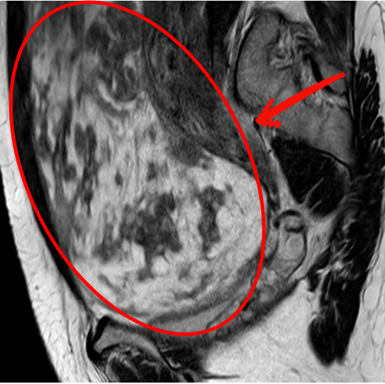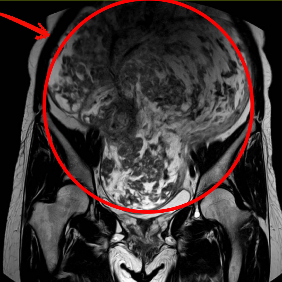 核磁共振进一步确认,这个肿块大小约28×18.58×34.8(厘米3),像冬瓜一样大,边界清晰,上顶横膈膜,下撑骨盆底,没有扩散迹象。