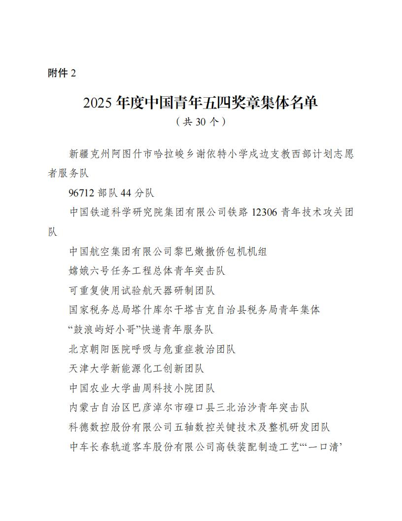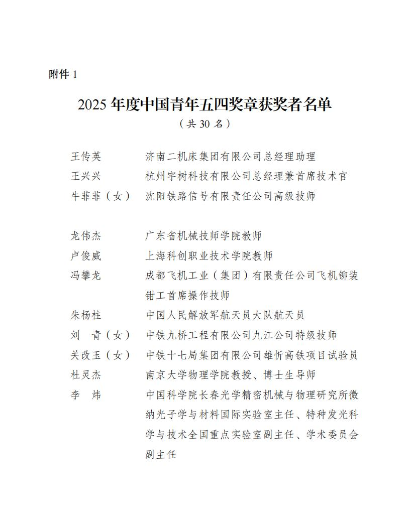 为表彰我国优秀青年在推进中国式现代化中的贡献,集中展示新时代青年的精神品格和价值追求,激励引导全国广大青年积极投身强国建设、民族复兴伟业,共青团中央、全国青联决定,授予王传英等30名同志2025年度中国青年五四奖章,授予新疆克州阿图什市哈拉峻乡谢依特小学戍边支教西部计划志愿者服务队等30个青年集体2025年度中国青年五四奖章集体,授予王崇鹏等677名同志2025年度新时代青年先锋奖。