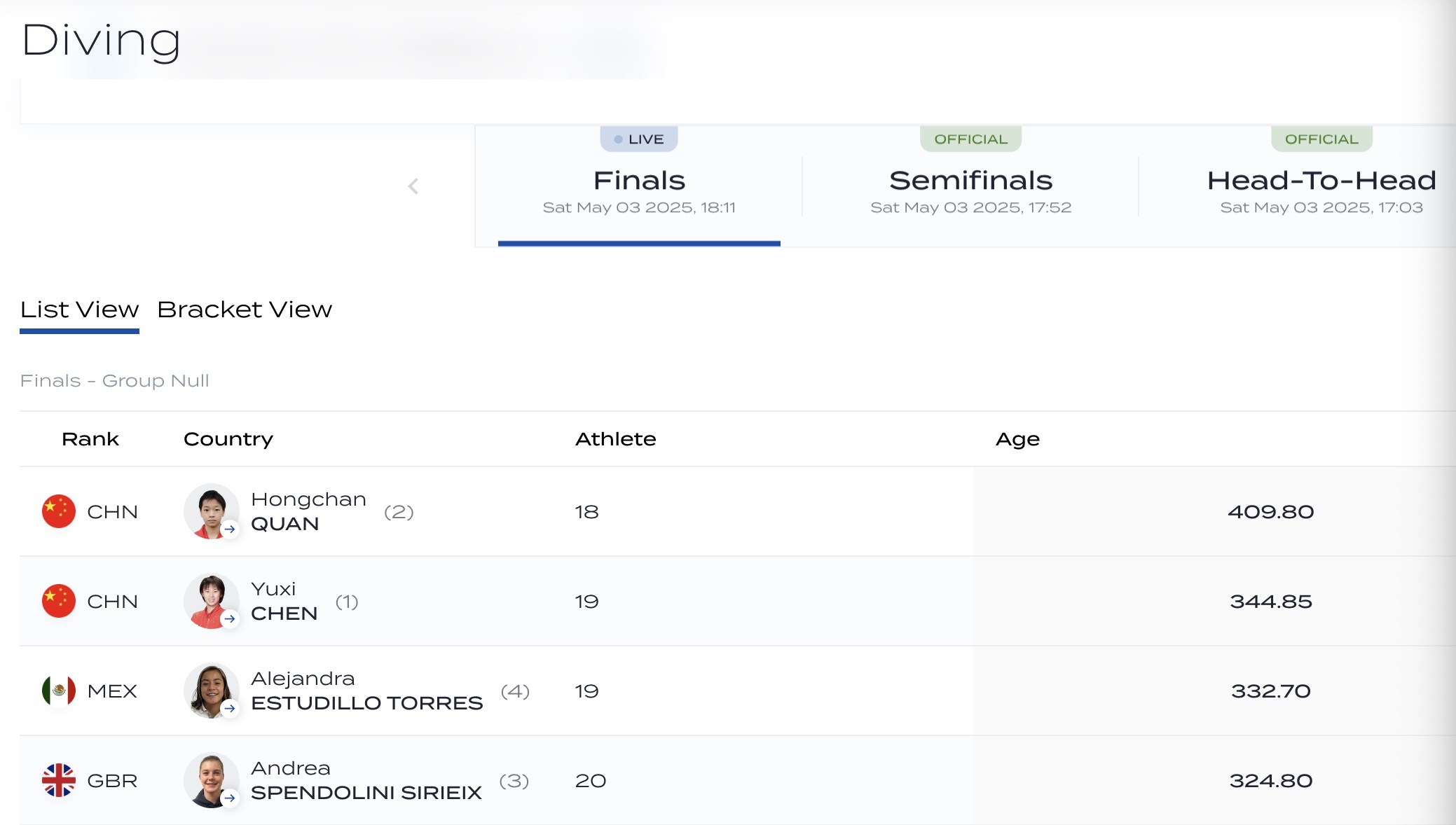 5月3日,2025年世界泳联跳水世界杯总决赛在北京国家游泳中心继续进行。在刚刚结束的女子十米跳台决赛中,中国队选手陈芋汐夺得冠军,全红婵获得亚军。这是二人继此前的世界杯瓜达拉哈拉站和温莎站后,再度包揽该项目冠亚军。
