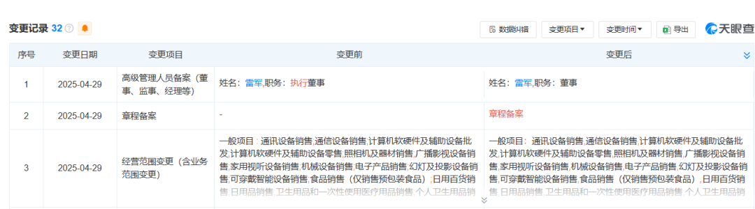 天眼查显示,近日,小米之家商业有限公司发生工商变更,雷军由执行董事改任董事,同时经营范围新增智能家庭消费设备销售、美发饰品销售。