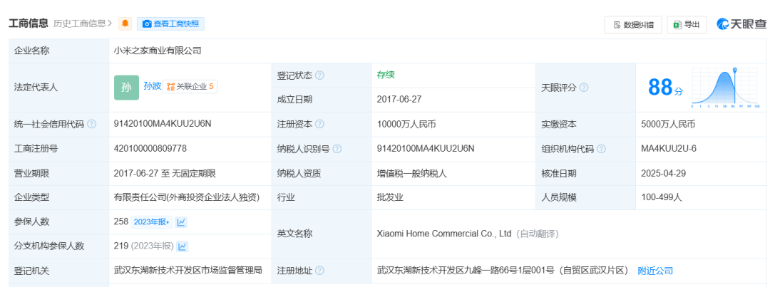 该公司成立于2017年6月,法定代表人为孙波,注册资本1亿元,经营范围包括通信设备销售、计算机软硬件及辅助设备批发等,由小米通讯技术有限公司全资持股。