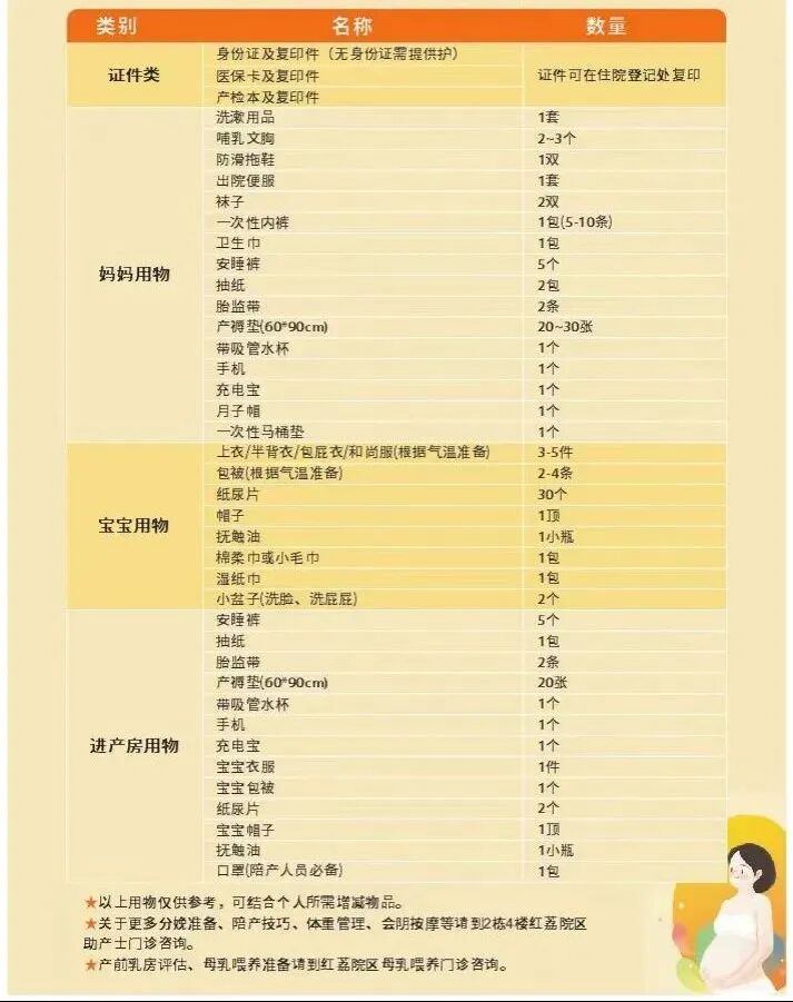 建议在怀孕32周左右就将待产包准备好并打包好,放在容易拿到的地方,随时准备出发~而且要让老公或者照顾者清楚知晓每一件物品的名称和摆放位置。