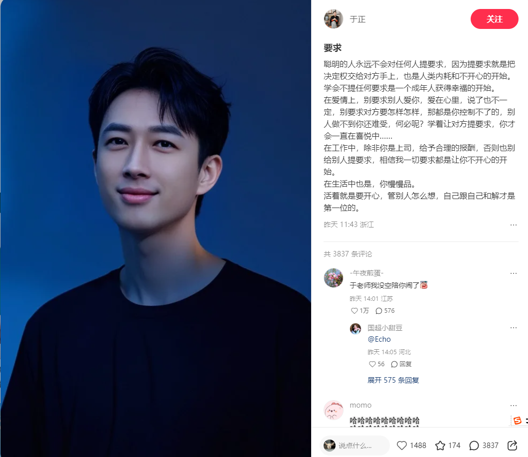 5月7日,于正又连发三张照片,配文“撕拉片”回应道:“啥年代了,P个图都需要羞耻,多么可笑。”“我长啥样,我很清楚,我喜欢每一寸的自己,但不妨碍我爱玩,爱接受新事物。”