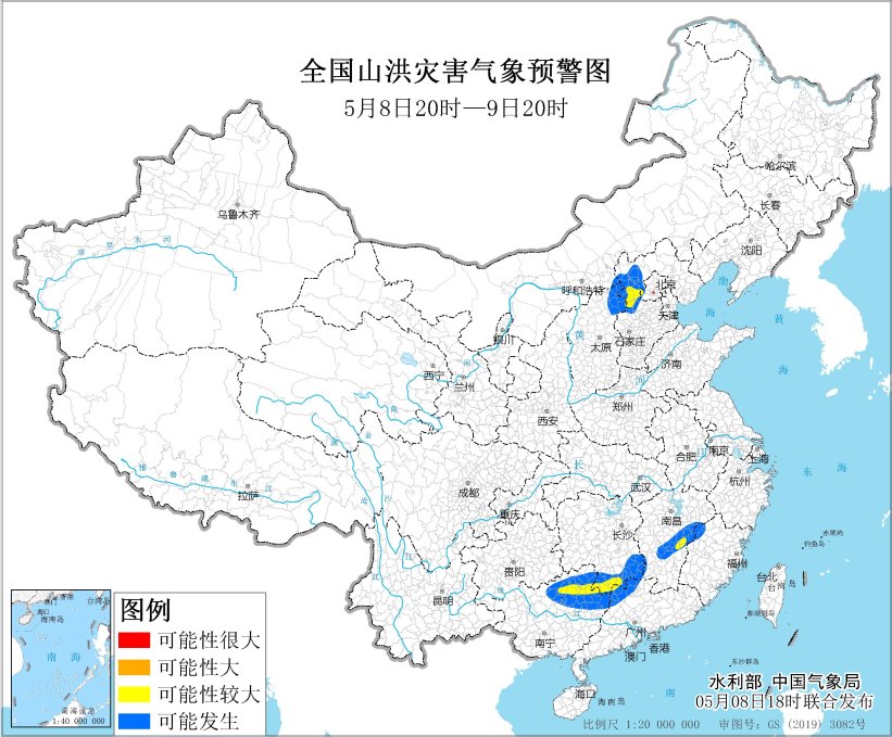 预计,5月8日20时至9日20时,北京西部、河北西部、山西东北部、内蒙古南部、福建西北部、江西中东部、湖南南部、广东西北部、广西东北部等地部分地区可能发生山洪灾害(蓝色预警),其中,北京西部、河北西部、山西东北部、江西东部、湖南南部、广东西北部、广西东北部局地发生山洪灾害可能性较大(黄色预警)。其他地区也可能因局地短历时强降水引发山洪灾害,请各地注意做好实时监测、防汛预警和转移避险等防范工作。