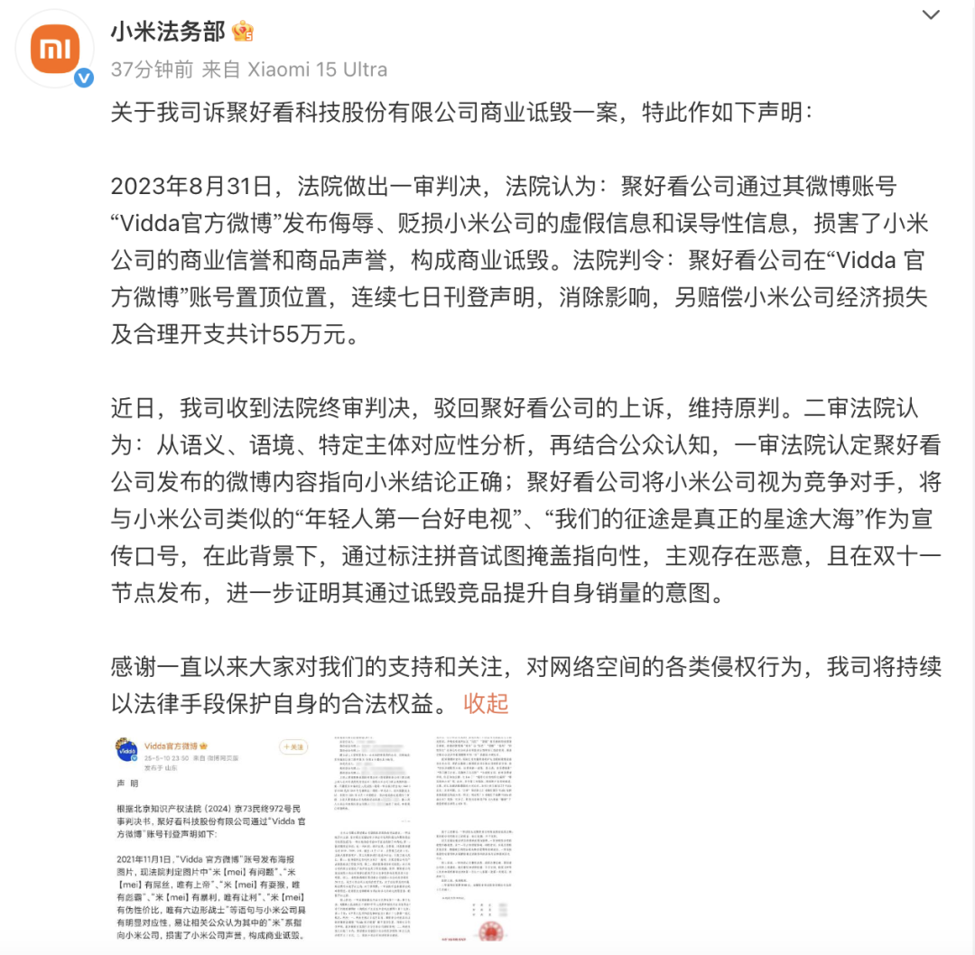 法院判令:聚好看公司在“Vidda官方微博”账号置顶位置,连续七日刊登声明,消除影响,另赔偿小米公司经济损失及合理开支共计55万元。