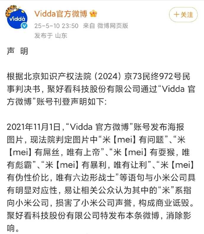 5月10日,聚好看科技股份有限公司通过“Vidda官方微博”刊登声明:2021年11月1日,“Vidda官方微博”发布海报图片,现法院判定图片中“米【mei】有问题”“米【mei】有屌丝,唯有上帝”“米【mei】有耍猴,唯有彪霸”“米【mei】有暴利,唯有让利”“米【mei】有伪性价比,唯有六边形战士”等语句与小米公司具有明显对应性,易让相关公众认为其中的“米”系指向小米公司,损害了小米公司声誉,构成商业诋毁。聚好看科技股份有限公司特发布本条微博,消除影响。