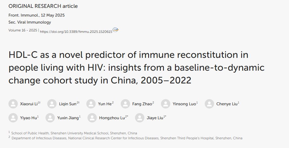2025年5月,深圳市第三人民医院卢洪洲教授团队在《Frontiers in Immunology》(《免疫学前言》)发表题为《HDL-C as a novel predictor of immune reconstitution in people living with HIV: insights from a baseline-to-dynamic change cohort study in China,2005–2022》的研究论文。深圳大学公共卫生学院硕士研究生李枭瑞和深圳市第三人民医院感染与免疫科孙丽琴副主任医师是该论文的共同第一作者,深圳市第三人民医院卢洪州教授和深圳大学公共卫生学院刘甲野副教授为共同通讯作者。
