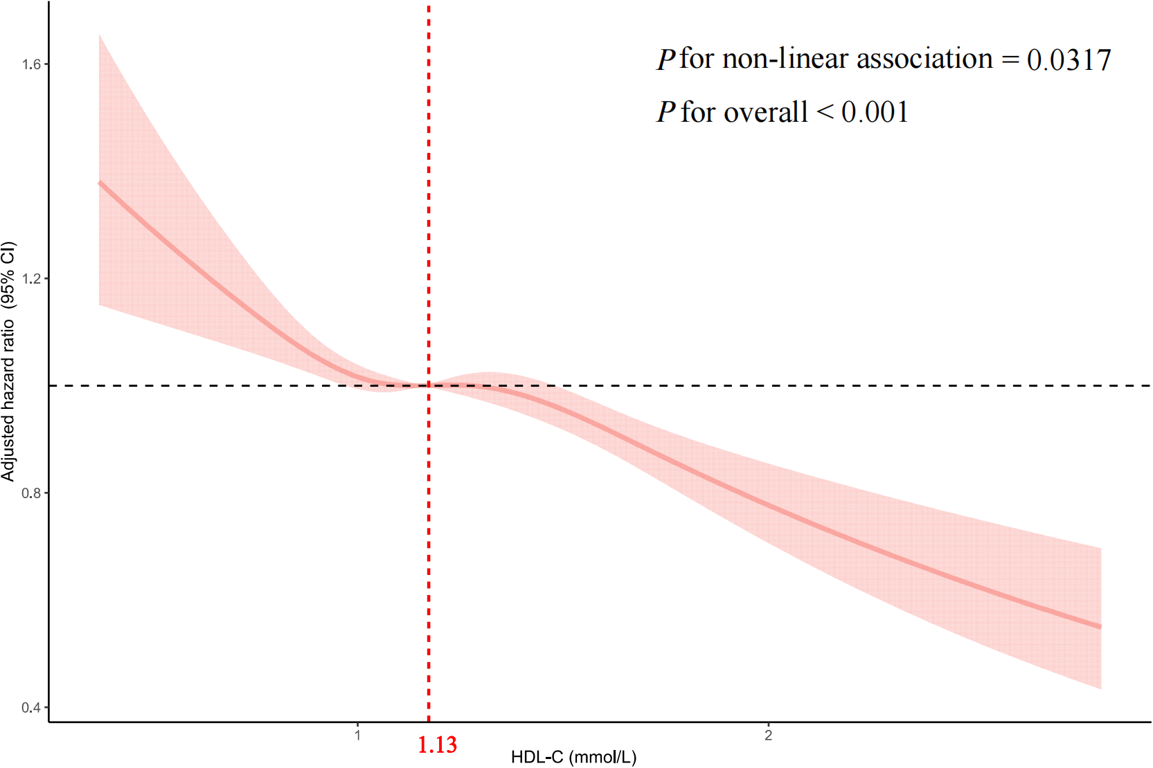 该研究基于深圳市第三人民医院2005年至2022年间初治HIV感染者的大型队列展开深入研究,首次系统评估了HDL-C水平与CD4+T细胞恢复之间的关系。结果显示,HDL-C与CD4+T细胞恢复呈非线性负相关关系,在阈值点1.13mmol/L处呈现出显著的拐点效应:当HDL-C水平低于该阈值时,每升高1mmol/L,CD4+T细胞恢复概率下降28%;而高于该阈值时,恢复概率仍下降22%(图1)。进一步的基于群体的轨迹模型分析发现,HDL-C水平维持较高(High-floating)者的免疫重建概率显著低于低水平组(Low-floating)。