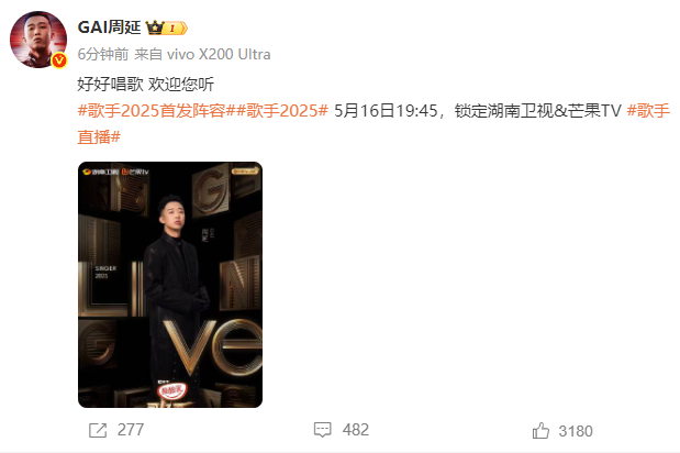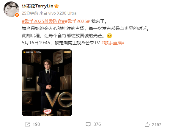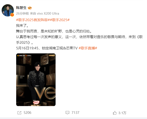 陈楚生:我来了。舞台于我而言,是未知的旷野,也是心灵的归处。认真思考过每一次发声的意义,这一次,依然带着对音乐的敬畏与期待,来到《歌手2025》。
