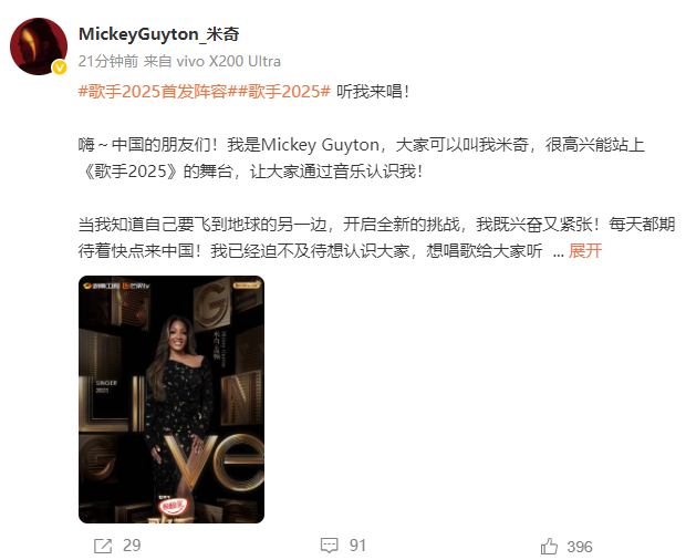 米奇·盖顿:嗨~中国的朋友们!我是Mickey Guyton,大家可以叫我米奇,很高兴能站上《歌手2025》的舞台,让大家通过音乐认识我!当我知道自己要飞到地球的另一边,开启全新的挑战,我既兴奋又紧张!每天都期待着快点来中国!我已经迫不及待想认识大家,想唱歌给大家听了!