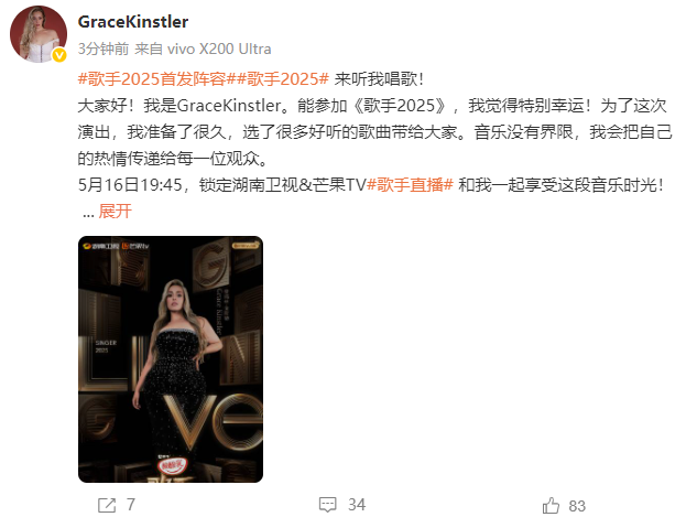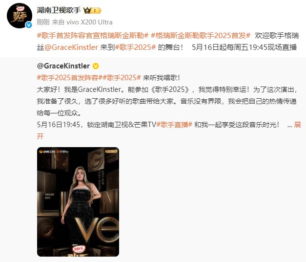 格瑞斯·金斯勒:来听我唱歌!大家好!我是GraceKinstler。能参加《歌手2025》,我觉得特别幸运!为了这次演出,我准备了很久,选了很多好听的歌曲带给大家。音乐没有界限,我会把自己的热情传递给每一位观众。