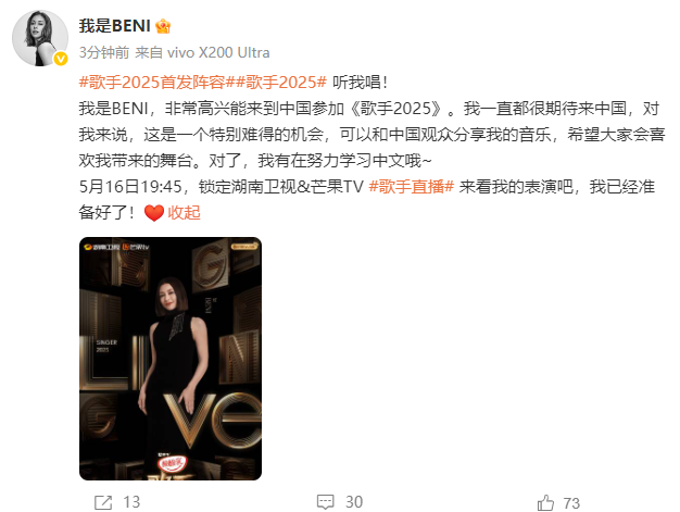 BENI:我是BENI,非常高兴能来到中国参加《歌手2025》。我一直都很期待来中国,对我来说,这是一个特别难得的机会,可以和中国观众分享我的音乐,希望大家会喜欢我带来的舞台。对了,我有在努力学习中文哦~