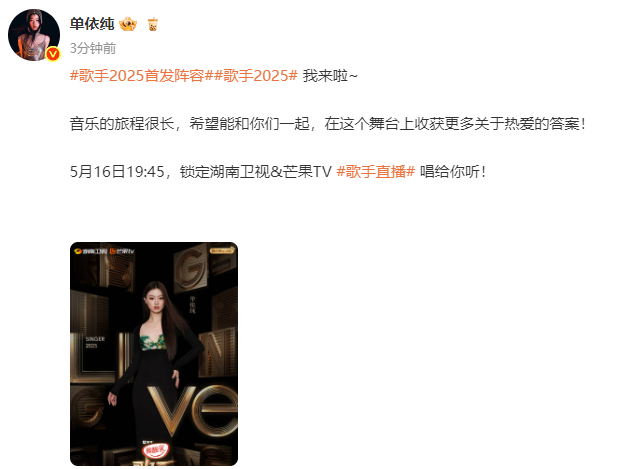 单依纯:我来啦~音乐的旅程很长,希望能和你们一起,在这个舞台上收获更多关于热爱的答案!