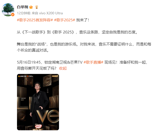 白举纲:从《下一战歌手》到《歌手 2025》,音乐这条路,坚定自我是我的态度。舞台是我的“战场”,也是我的游乐场。对我来说,音乐不需要证明什么,而是和每个听众的真诚对话。准备好和我一起,用音符撕开天花板了吗?