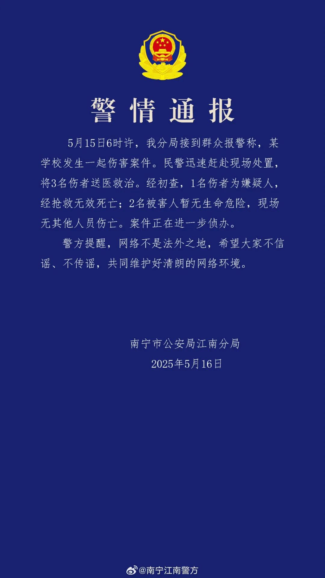 5月16日晚,南宁市公安局江南分局官方微博发布警情通报: