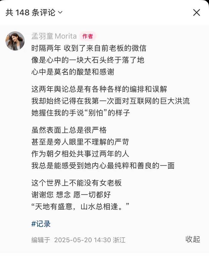 5月20日下午,孟羽童在社交平台发文称,“时隔两年,收到了来自前老板的微信,像是心中的一块大石头终于落了地,心中是莫名的酸楚和感谢。”