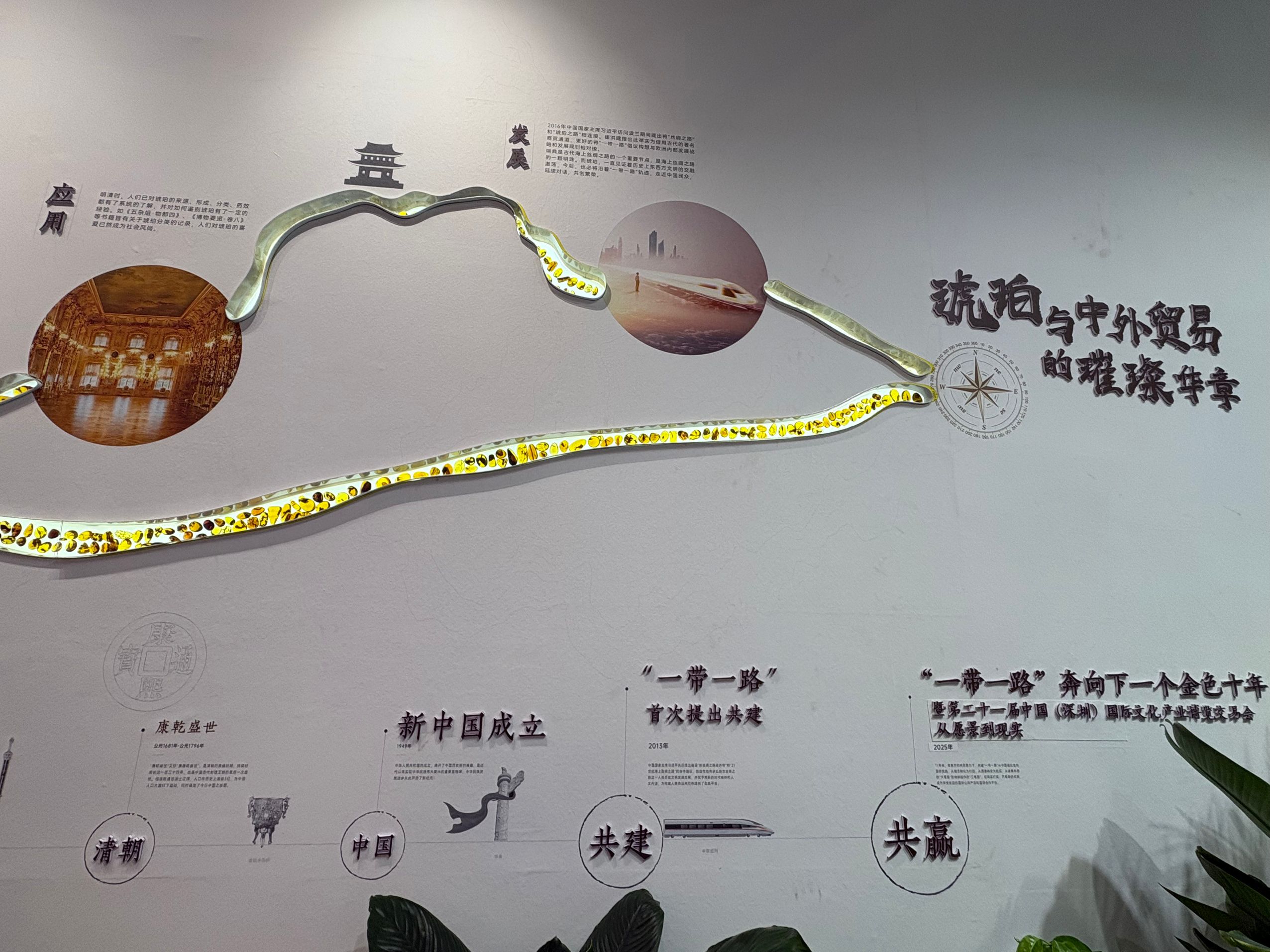 特设的“琥珀之路”艺术装置贯穿古今:627枚珍稀琥珀串联维京商队驼铃、宋代海舶帆影与当代中欧班列轨迹,下方对应秦统六合至“一带一路”的历史刻度,构建物质文明与自然瑰宝的双螺旋基因链。