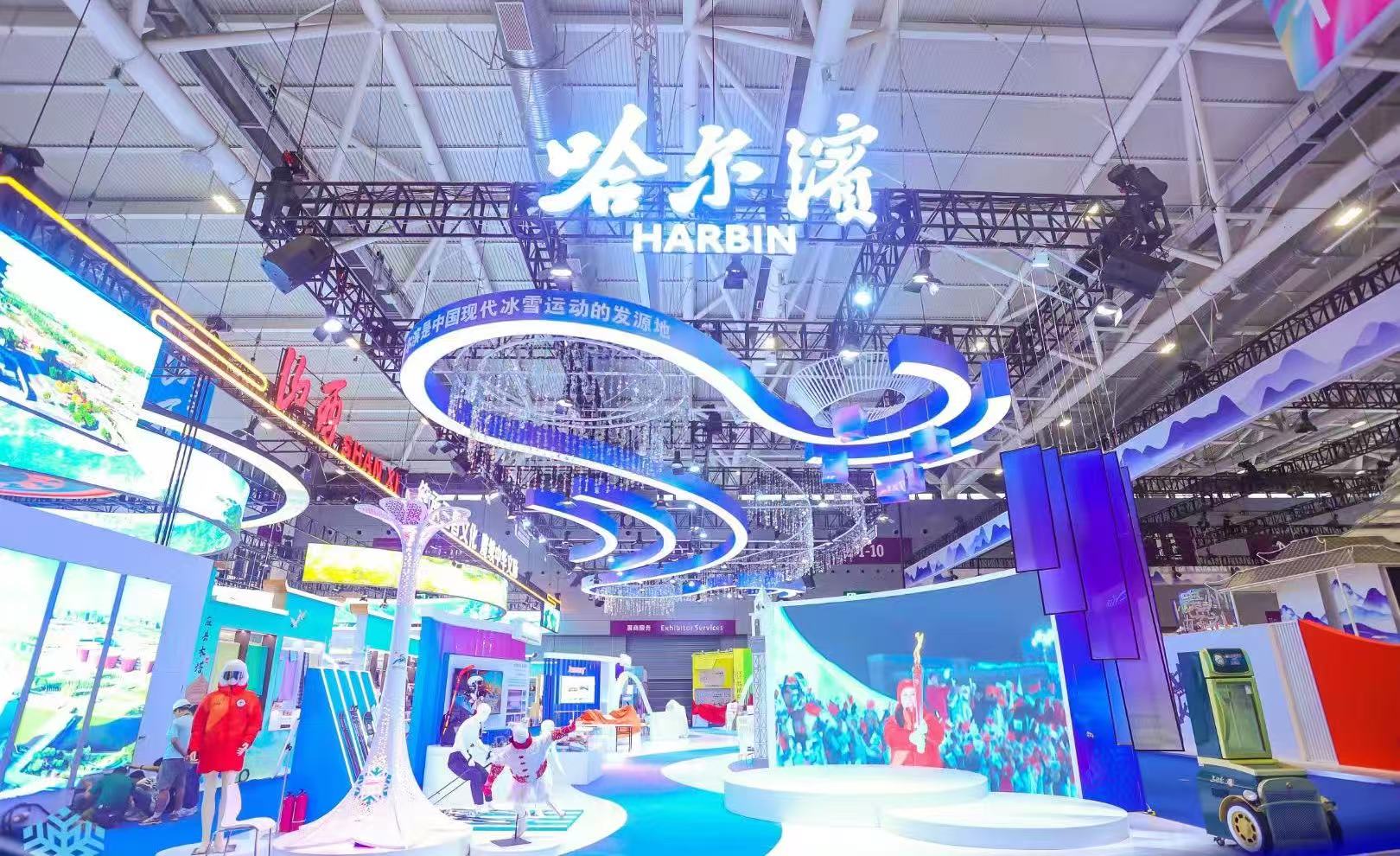在其身后,以“打造世界级冰雪旅游度假胜地和冰雪经济高地”为主题的哈尔滨展区既有洁白无瑕的冰雪世界、亚冬会,也有黑土地上孕育的丰富物产、富有冰城特色的文创产品,更有“音乐之城”“中国诗歌之城”。