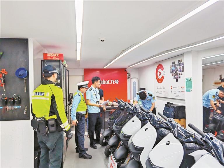 ▲执法人员对电动自行车销售门店进行突击检查。