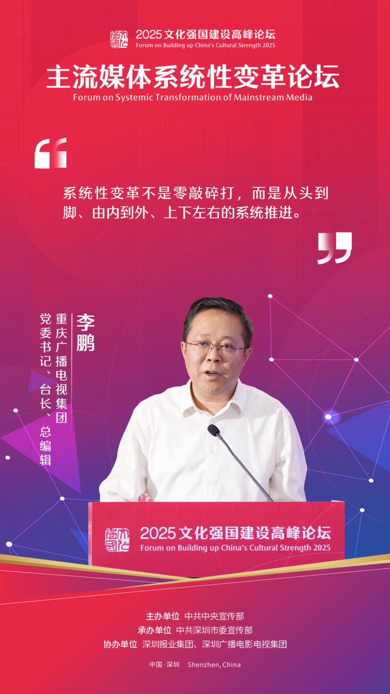 5月27日,2025文化强国建设高峰论坛之“主流媒体系统性变革论坛”上,重庆广电集团(总台)党委书记、台长、总编辑李鹏作了题为“内容焕新 技术创新 产业革新 形成具有重庆广电辨识度的标志性改革成果”的主题发言。