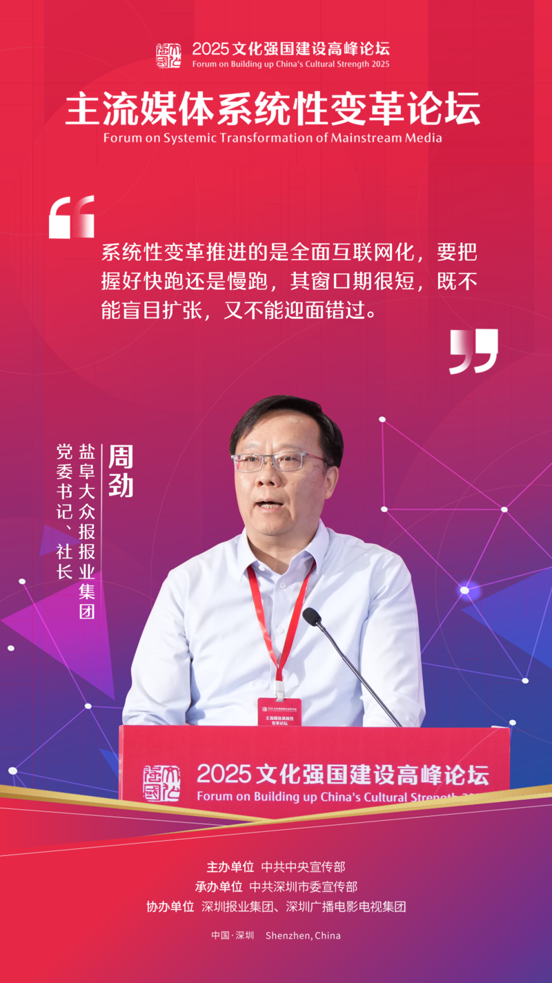 周劲指出,“推进主流媒体系统性变革”是党的二十届三中全会部署的重大改革任务。与央媒省媒相比,市县主流媒体作为基层舆论传播的“最后一公里”,面临更多挑战,但改革势在必行。盐阜大众报报业集团通过“顶层—中层—底层”三层协同式推进,绘制了“数智大厦建设图”,成功开辟出一条具备复制价值的实战路径,其改革案例入选《习近平文化思想实践案例选编(2024 年)》,成为全国地市级媒体中的唯一入选者。