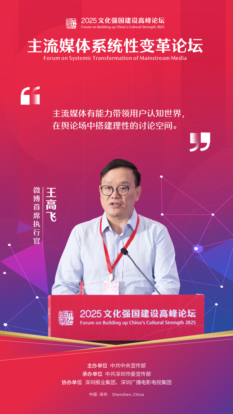 5月27日,2025文化强国建设高峰论坛之“主流媒体系统性变革论坛”上,微博首席执行官王高飞作了题为“以社交传播推动时代共识,聚平台势能激扬主流声音”的主题发言,分享网络平台如何在新趋势下用新技术、新机制为主流媒体持续服务、持续赋能。