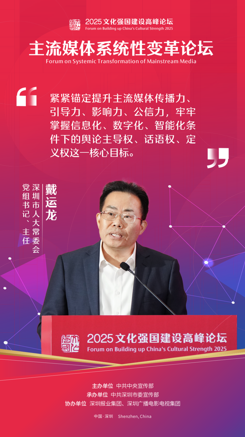 5月27日,在2025文化强国建设高峰论坛“主流媒体系统性变革”论坛上,深圳市人大常委会党组书记、主任戴运龙在开幕致辞中表示, 深圳报业集团、深圳广电集团5月20日发布了改革方案,吹响了主流媒体系统性变革的冲锋号。深圳此次推进主流媒体系统性变革,紧紧锚定提升主流媒体传播力、引导力、影响力、公信力,牢牢掌握信息化、数字化、智能化条件下的舆论主导权、话语权、定义权这一核心目标。