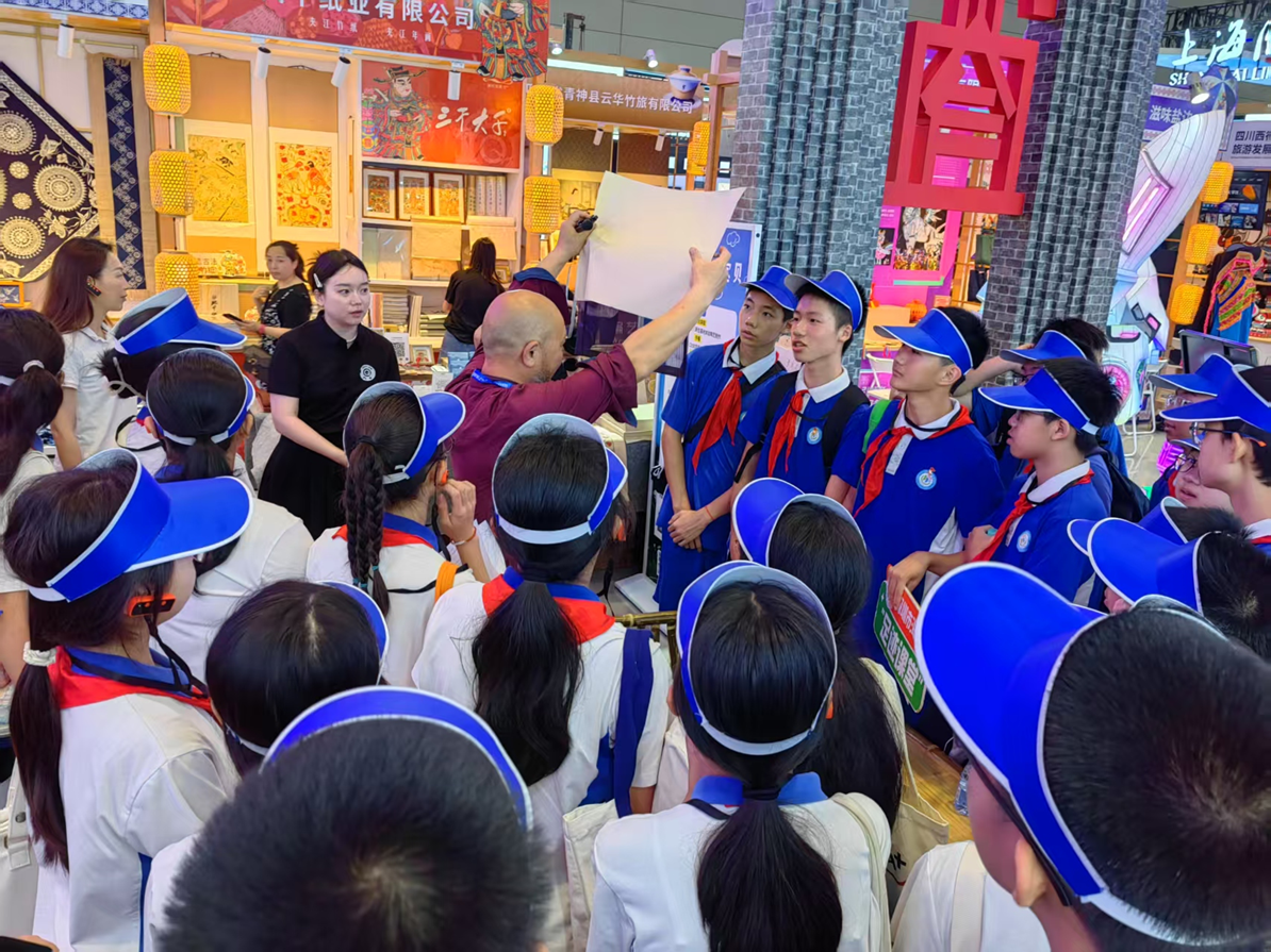 展会现场,AI导览机器人、裸眼3D数字冰雪、机器狗醒狮表演等科技与文化融合的场景,让海湾中学、弘雅小学等学校的学生沉浸式感受“文化+科技”的魅力。新安中学(集团)第二外国语学校的学生通过“薰城宫灯”探照技术与AI复原的《正定胜迹图》跨时空对话,立新湖学子在VR星际空间中体验“古代箭雨”与AI咏春拳,这些互动项目将抽象的科学原理转化为直观体验,激发了学生的探索热情。滨海小学学生在非遗大师指导下临摹《泼彩朱荷图》,弘雅小学学子体验木版年画与糖画制作,海湾中学学生亲手拓印夹江年画、实践千年造纸技艺……传统技艺与现代科技的碰撞,让“匠人精神”与“创新思维”在学生心中生根发芽。
