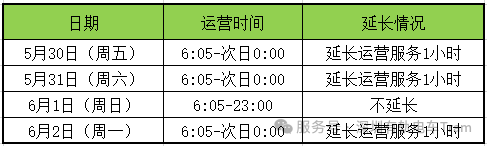5月30日、5月31日及6月2日,深圳地铁各线路将延长运营1小时,各线路末班车发车时间延长至24:00前后;其中地铁4号线将延长运营约1.5小时。