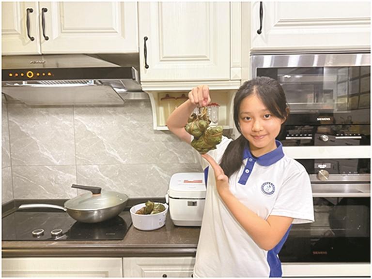晨曦刚给玻璃镀上金边,外婆已将食材阵列在案板上。泡了整夜的糯米泛着珍珠光泽,肥瘦相间的五花肉裹着秘制酱汁,琥珀色的咸蛋黄在瓷盘里流转着光晕。从选粽叶开始,粽叶要选宽大完整、颜色鲜绿的叶子,这样包出来的粽子卖相才会更加诱人。我从一叠粽叶中小心翼翼地拿起一片,却不想把叶子弄破了,外婆笑着说:“别着急,慢慢来,包粽子就像做事情,要耐心细致。”