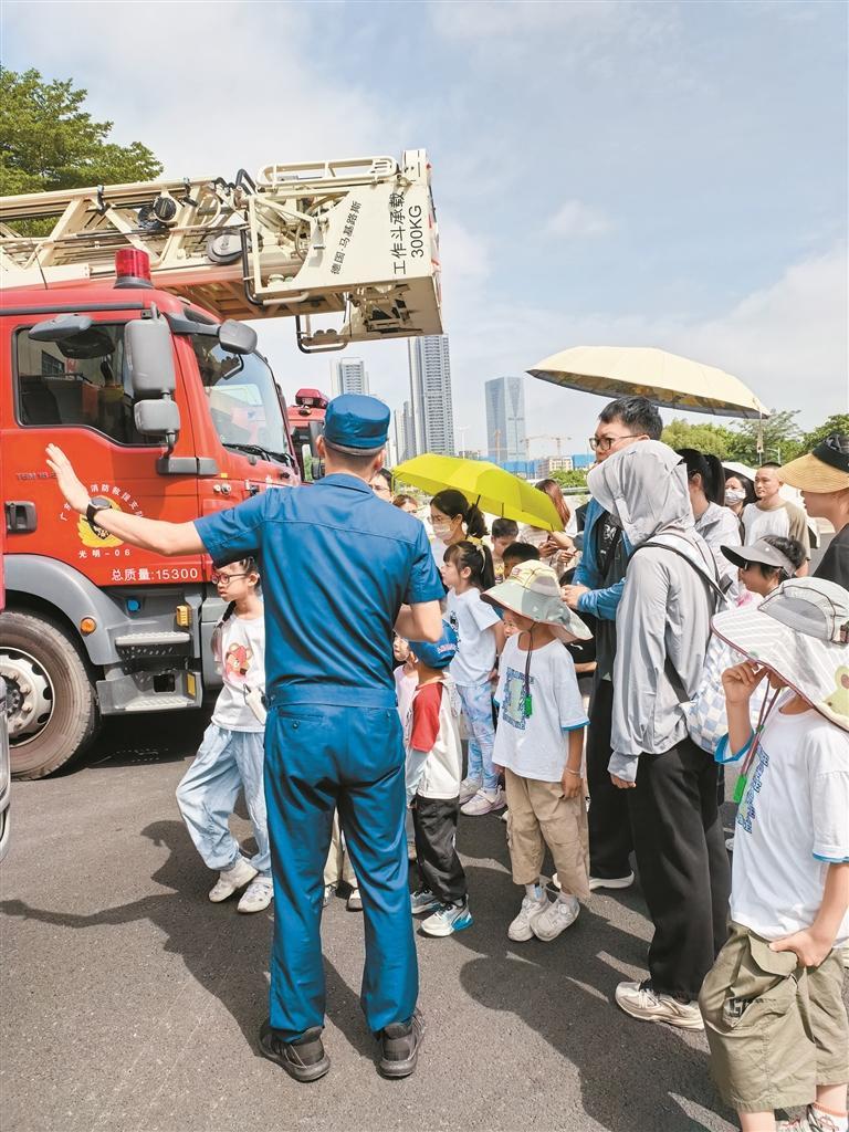 在观摩消防车环节,消防员详细讲解了不同车型消防车的功能。随后,消防员救援出动演示开始。警铃骤响,消防员们迅速着装、登车、爬楼,一系列动作行云流水,充分展现了“逆行者”的速度与担当。