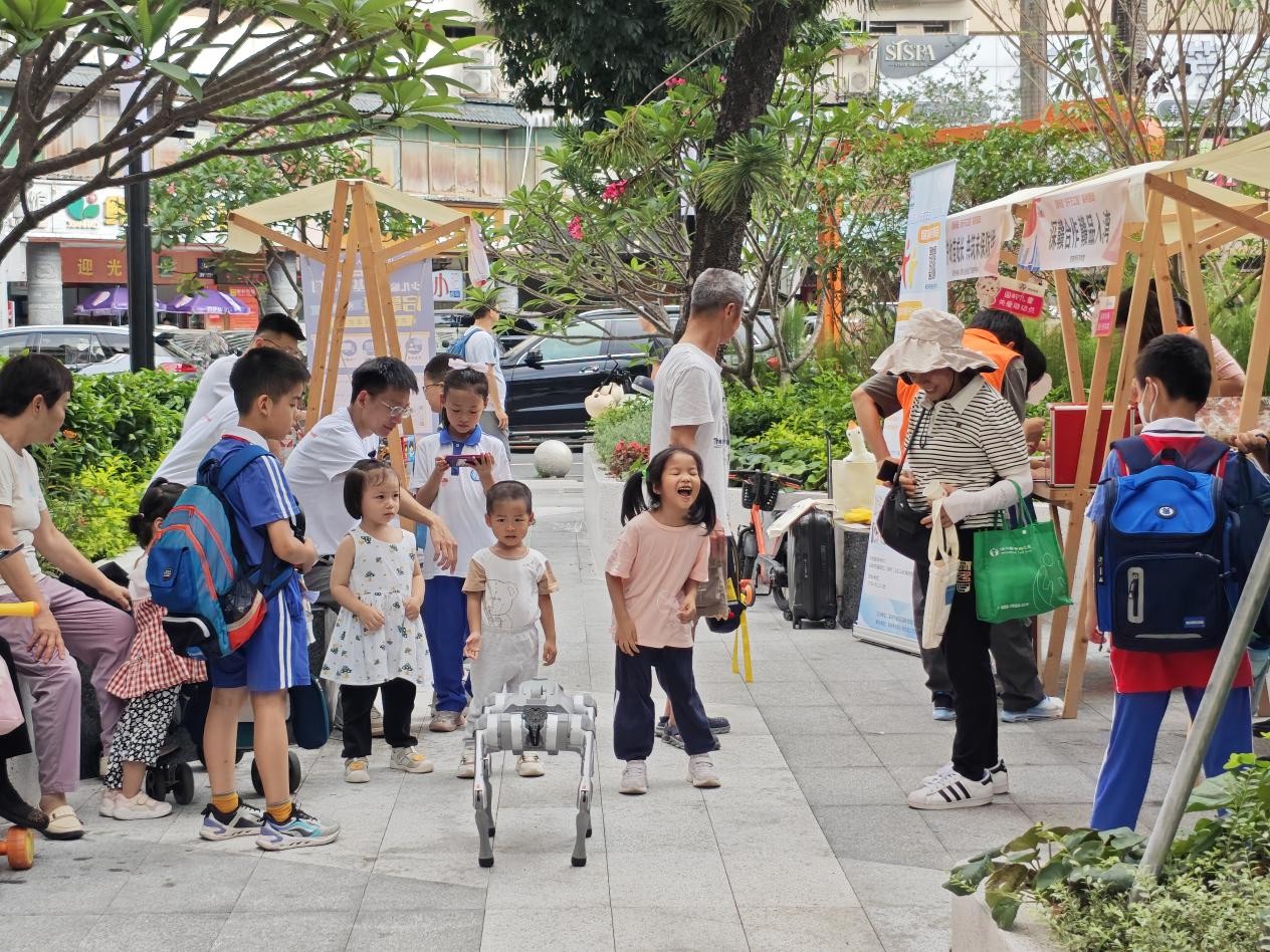 “智启未来——AI仿生伙伴创新体验日”摊位前,成为青少年的“打卡”热点,四足机器人吸引了众多孩子的目光。参与者不仅可以近距离观察机器人的运动算法和多模态交互系统,还能通过可视化控制终端,亲手操作机器人完成步态切换、动态避障等任务挑战。