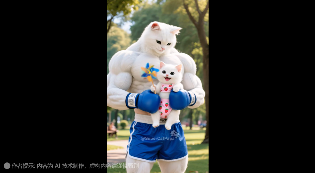 与简单的“穿衣戴帽配音”的初级玩法不同,如今的AI宠物短剧让人工智能技术深度赋能萌宠,将它们打造成能精准演绎喜怒哀乐的“专业演员”,用科技的力量重新定义宠物视频的可能性边界。去年在YouTube平台爆红的《神猫奶爸》,开创了AI宠物短剧的先河。这部讲述橘猫当“奶爸”照顾人类婴儿的离奇短剧,凭借荒诞剧情,配合AI生成的猫咪形象,仅用简单的图片拼接技术就创造了2亿播放、半年百万粉丝的成绩。