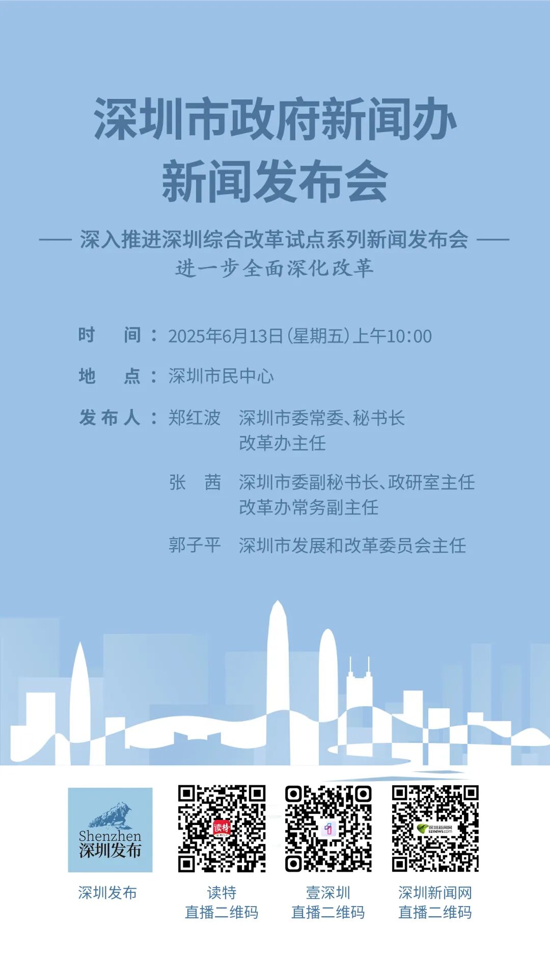 2025年6月13日(星期五)上午10:00,深圳市将举行新闻发布会,介绍深圳市贯彻落实《关于深入推进深圳综合改革试点深化改革创新扩大开放的意见》的相关情况,以及进一步全面深化改革的情况
