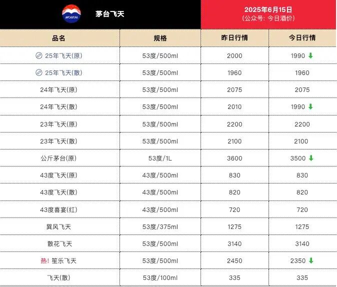 6月15日,25年飞天茅台原箱较前一日下跌10元,报1990元/瓶;24年飞天茅台散瓶较前一日下跌20元,报1990元/瓶。